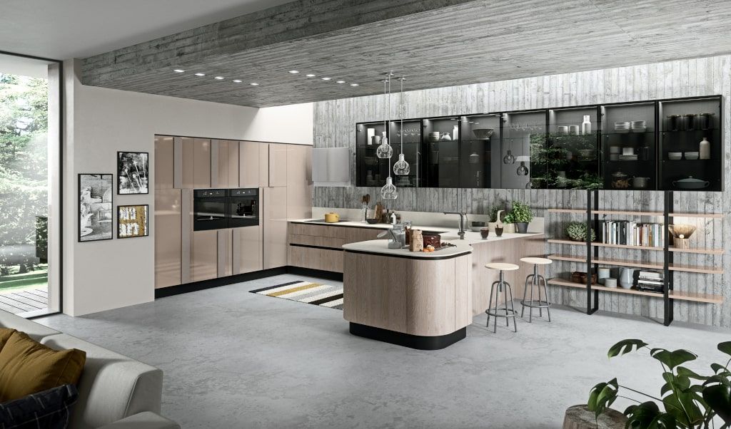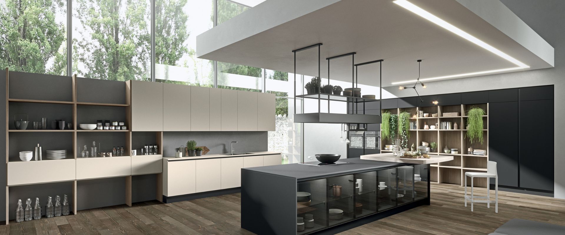 Le ante si presentano in una vasta gamma di colori e finiture che ben si adattano agli elementi a giorno disponibili in quercia moka o porfino nero mika: laccato bianco lucido, laminato quercia moka, larice rovere e quercia mandorla costituiscono solamente alcune delle numerose opzioni di cui disporre per comporre una cucina su misura che risponda in maniera rapida e immediata alle proprie esigenze di spazio, funzione e design.